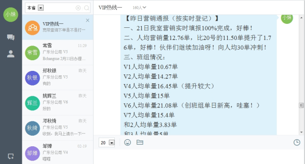 1)每天一早通过座席交流、弹框便笺、微信全方位把昨天营销情况进行通报,让伙伴们来挑战: