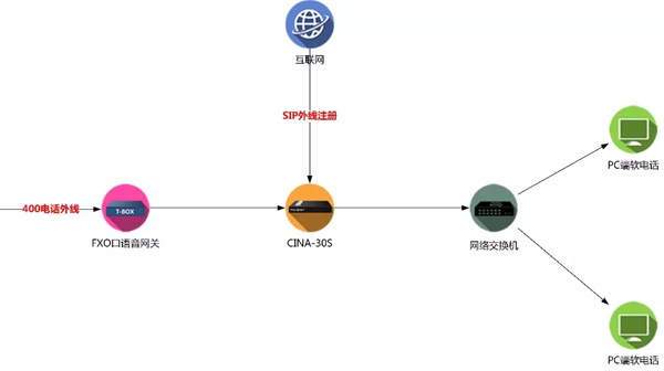 2.接入O语音网关,对接客户现有的PSTN线路,并与客户现有的400进行绑定。