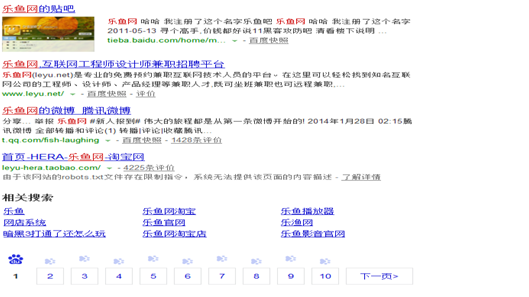 首页标题需包含最主要的关键词,其中网站名称应该基本都是独一无二的,如果碰到比较热门的名称,可以考虑加大优化力度,确保搜索网站名称时出现在第一的位置。一般网站不会出现比较热门的词汇,只要网站有一定的内容作为基础,优化难度基本不大。下面说一下比较热门词的优化。比如笔者最近优化的网站乐鱼网(一个兼职网站 leyu.net)。这个网站在“乐鱼网”这个关键词的排名如下: