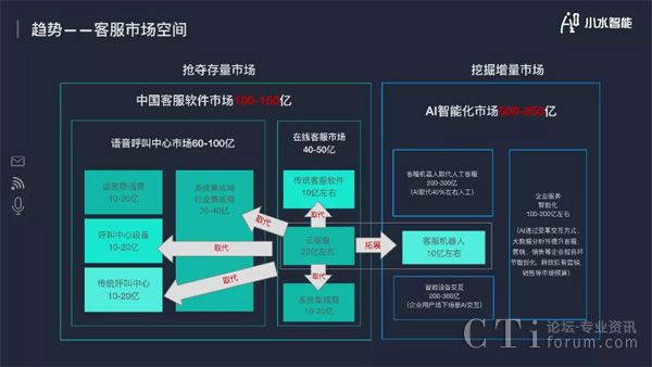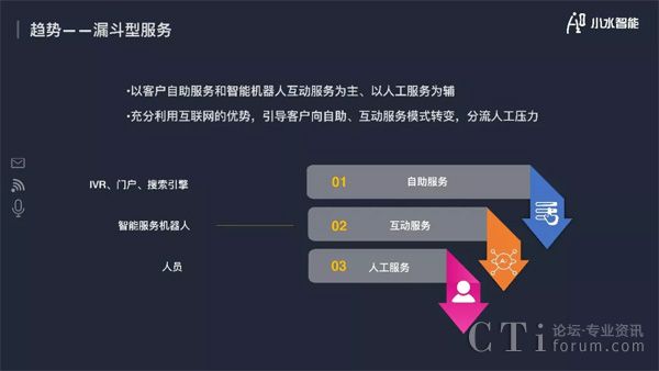 对于这个平台应用的需求来说,我们信心满满。因为目前智能客服市场规模和市场空间非常大,国内传统客服软件领域预计存在100—150亿的市场份额,智能化客服的增量领域存在500—800亿的市场份额。而对于行业来说,整体的服务趋势将逐渐演变为“漏斗型服务”。也就是说,人工智能和互动服务将逐渐取代原来传统的人工服务。