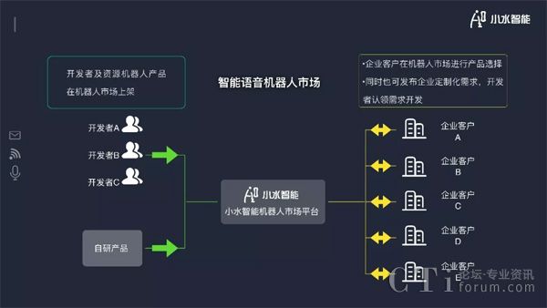 而智能语音机器人交易平台则是对整个智能语音行业的整合。开发者可以将话术流程,语音模拟方案等放入该平台;企业同样可以发布需求,或选择已有的服务方案。深入行业的开发者可在平台上接单,之后通过小水智能的审核最终发布。