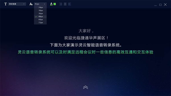 发言实时上屏:针对不同会议的需求,系统可将实时语音转写的结果,以弹幕的形式展现在大屏上,方便现场听会者阅读。