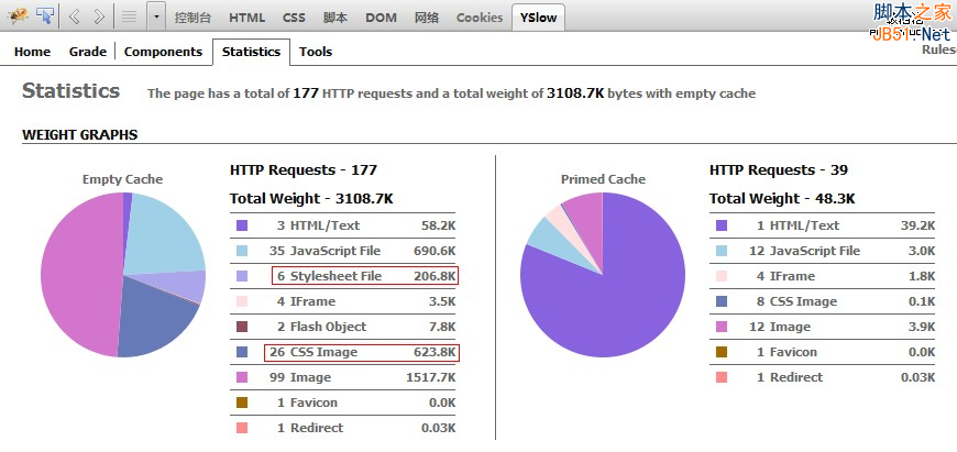首先我们通过yslow的statistics查看新浪微博最新版首页的文件,得到Stylesheet File(CSS文件)大小为206.8K, CSS Image大小为623.8K。明显发现CSS文件比CSS Image小很多。