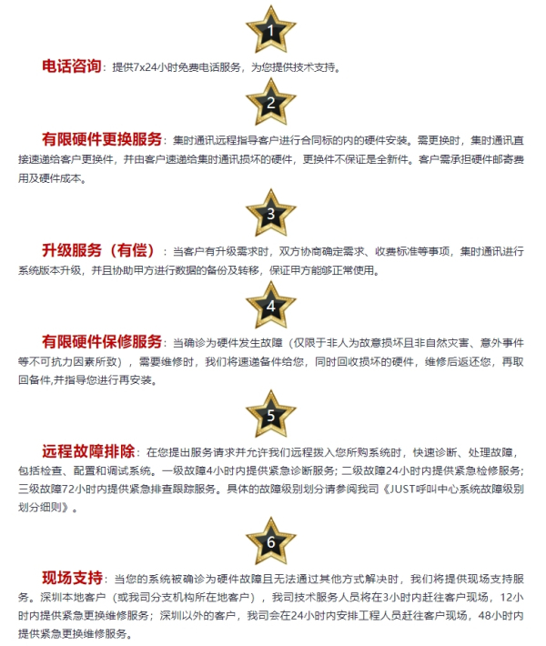 并且,自系统安装完毕之日(以系统《工程施工报告》或《验收报告》签署日期为准)起一年内,集时通讯将为您所购JUST呼叫中心系统,提供六大售后服务: