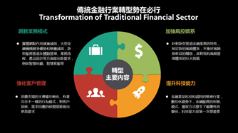 在谈到传统金融行业转型升级时,朱频频博士从创新业务模式、加强风控体系、强化客户管理、提升科技能力四个方面分别说明了传统金融行业转型的必要性。