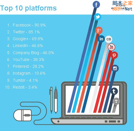 2012年,只有不到20%的被调查对象没有使用过社会化媒体工具,今年,这个数字下降到11%。buffer进入前10榜单,但也有只有14%的被调查对象使用(2012年只有不到4%)。