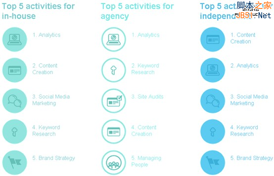 在过去一年,网站分析仍然处于领先地位。不过有趣的是,只有很少一部分人(1.6%)专注在“网络分析”领域。网站分析是所有网络营销行为的必备。 内容营销排名有所上升(2012的第5到今年的第2),虽然有可能是这个术语过于宽泛的缘故。链接建设跌出前5,但关键词研究依然在前5。
