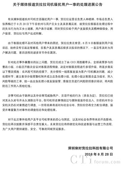 针对日前货拉拉司机涉嫌骚扰女用户一事,货拉拉公司运营负责人、市场负责人已于8月28日晚在杭州与用户王女士及其亲属见面,就客服在处理投诉过程中的失当行为道歉,并给予用户直接损失补偿、精神赔偿金,与用户达成和解。