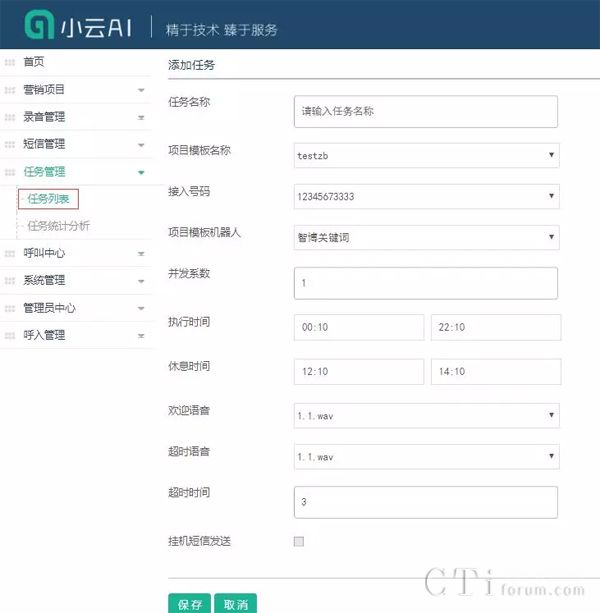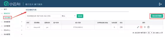 登陆小云AI系统(ai.ucpaas.com),选择左侧的【任务管理】>>>【任务列表】,点击【添加外呼任务】按钮,按要求完成填写操作即可(项目模板提前创建供选择详见第五点)