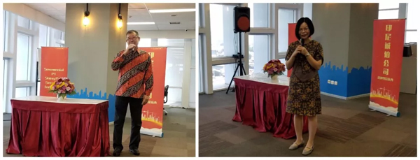 左:印尼侨领郭先生致辞 右:诚伯公司陈律师致辞>