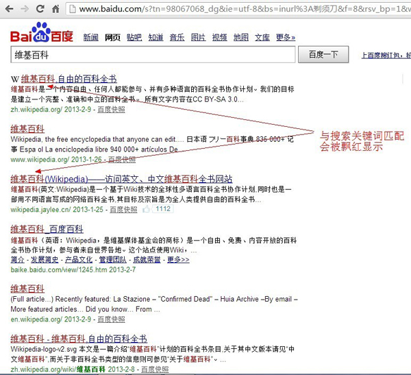 大家都知道,在用搜索引擎搜索关键词时,搜索结果中的网页标题会对关键词飘红显示,以表示网页与关键词的相关性,以搜索“维基百科”为例,结果如下图: