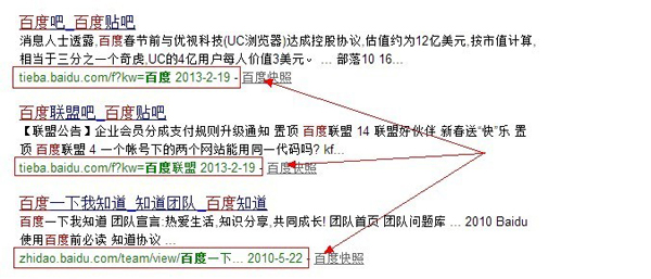加粗的URL会在一定程度上吸引用户的注意,进而提高点击率,并且对中国人来说,中文URL结构比较清晰,可以直接从URL上判断网页内容,这对网站是非常有帮助的。搜索引擎在搜索结果中对中文URL做出加粗的处理就是对中文URL做出的肯定态度。而且,搜索引擎在自己的产品中也大量使用了中文URL,在百度中查询“inurl:百度”会看到很多百度自己的产品使用中文URL的结果: