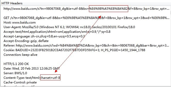用百度搜索关键词时,查看HTTP请求的头信息也可以查看百度将汉字转换的过程,例如用百度搜索“春节”时,HTTP请求的头信息显示如下: