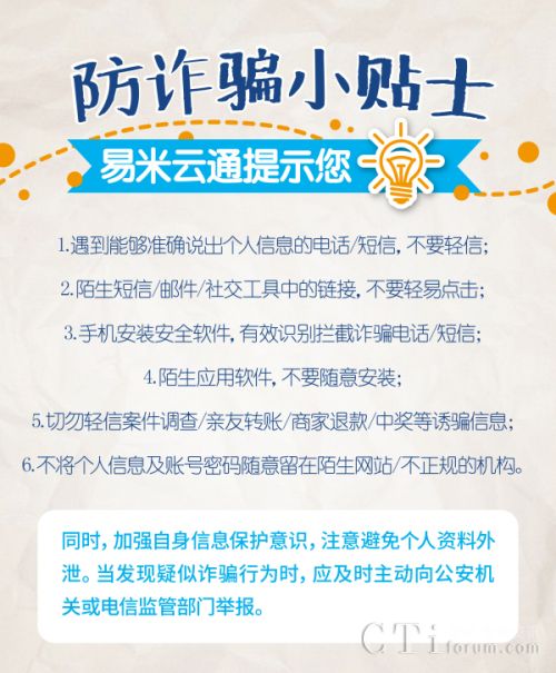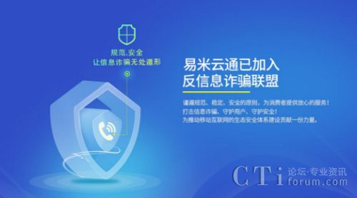作为反信息诈骗联盟一员,易米云通谨遵规范、稳定、安全的原则,严厉打击信息诈骗,为推动移动互联网安全生态体系建设贡献一份力量!