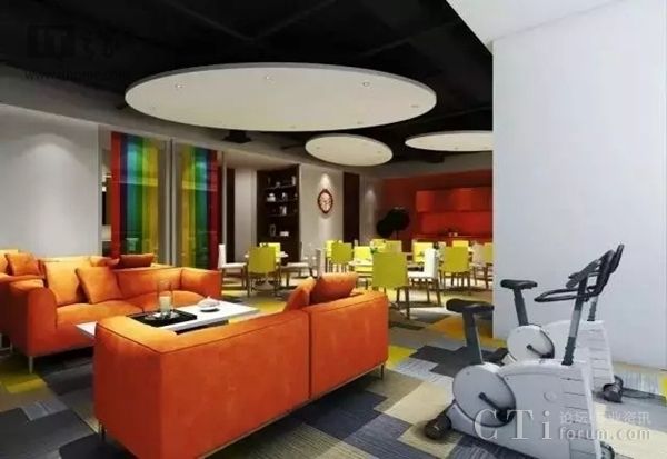 从内景图来看,京东这座客户服务中心拥有休息区、运动场地、主题会议室、健身区、图书区等多种设施,工作之后可以免费使用。
