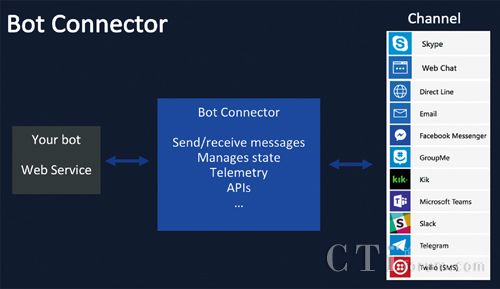 Bot Connector包含在Bot Framework提出的Bot Builder SDK中,可支援.NetC#、Node.js开发环境,并且提供传送讯息撰写Payload格式的规则。开发人员只要完成Web Service开发后,在Bot Framework官方网站上设定串接Facebook、Skype等通道,之后即可交由Bot Connector传送至各个通讯平台。如此一来,只要采用共通的SDK建立各项机制,例如基本传送讯息与回应,根本无须研究各种不同通道的JSON格式,即可最大化重复使用程式码,甚至可能只要撰写一次,就有机会在不同通道上建立聊天机器人。当然,Bot Framework仍有保留特定的属性,让开发人员自行定义更符合企业商业应用场景,抑或是通讯软体本身内建特有的功能项目,在Bot Connector的介接协助下皆可辨识。