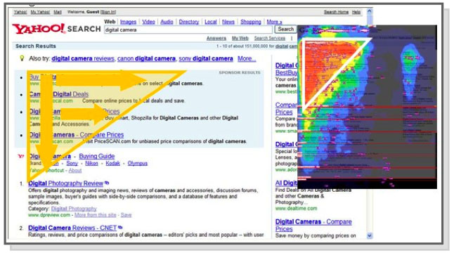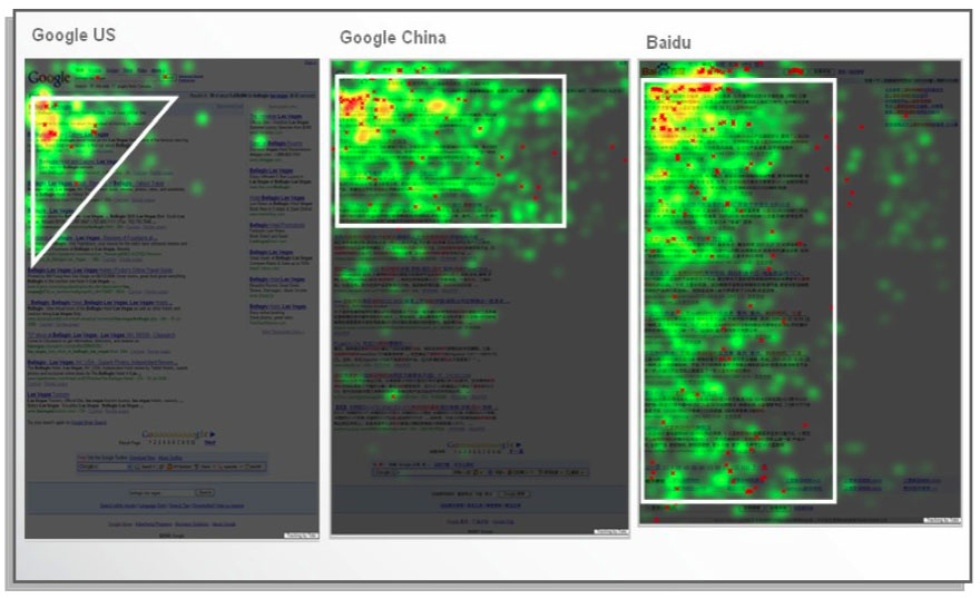 最重要的是,这次研究“没有发现任何与北美用户的F形扫描模式相近的证据。事实上,我们看见了一个更加离散的模式,而不是一个完整的模式。扫描点几乎出现在结果列表的每一个位置,而且前进(progress)速率比北美用户更加的快。”