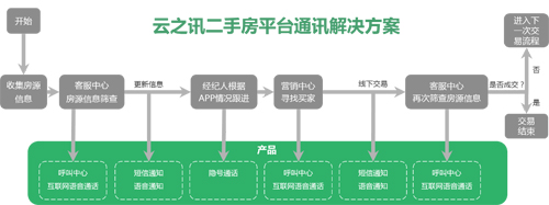 云之讯二手房交易通讯解决方案,针对二手房交易流程中所需的沟通需求及时间点,使用不同产品组合,以此来解决整个流程中的通讯管理难题。