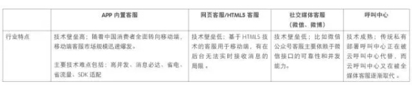 当前国内的主要接入渠道包括移动APP内置客服、网页客服/HTML5客服、社交媒体客服(微信、微博)和呼叫中心。由上表可见除开移动APP内置客服以外,其余三个主流的接入门槛较低,技术标准化且成熟,核心难点在于移动端接入。