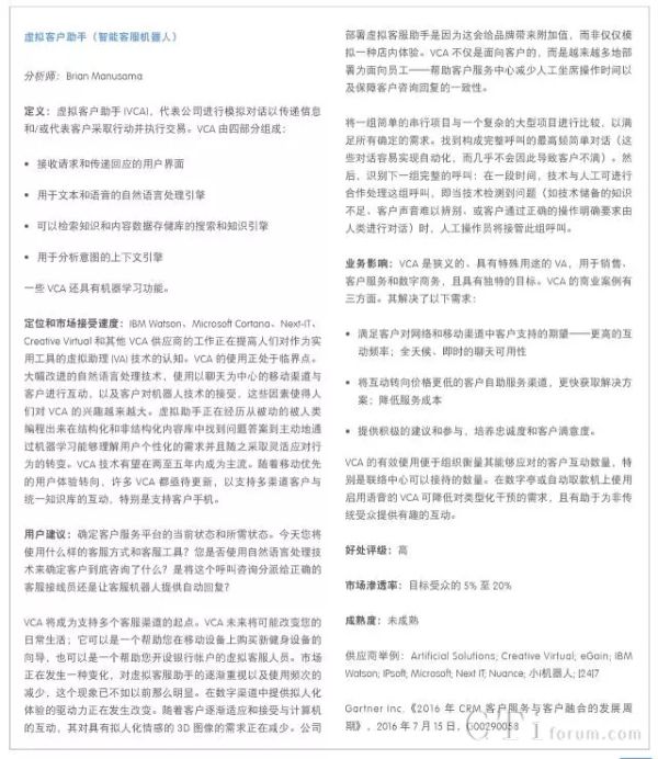 Gartner报告指出智能客服机器人(VCA-virtual customer assistance)的使用正处于临界点。大幅改进的自然语言处理技术,以聊天为中心的移动渠道与客户互动的应用,以及客户对机器人技术的接受程度,这些因素使得人们对VCA的兴趣越来越大。