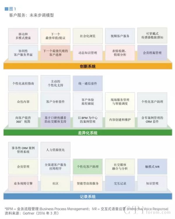 Gartner认为技术创新有时领先于客户需求,有时滞后于客户需求。在本报告中,我们采用步调分层这一方法从以下三个层次对现有和新兴技术要求做了分析:记录系统、创新系统、差异化系统。对于客户服务,我们划分了下列层次: