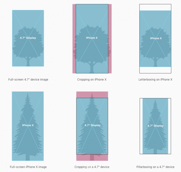 由于iPhone X长出来一截,因此之前全屏比例的图片在iPhone X上就会变形,如下图所示,因此开发工程师可能为了适配,将原有的图片拉大,充满整个屏幕,如果不拉大,那么就会出现下图第一排最右边图的效果,上下白边非常难看。另一种情况,你的图片可能会挤压变形,那就是第二排图片的样子了。