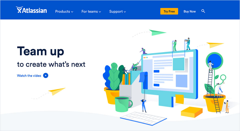 Atlassian用配色明快的图形插画描绘了齐心协力的工作场景,烘托出“Team up”的产品价值主张: