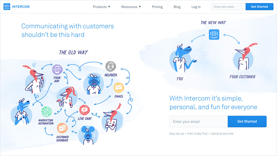Intercom用生动的手绘风插画描绘了一副工作中遭遇的混乱场景,引出了使用Intercom可以结束这一切混乱的概念: