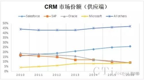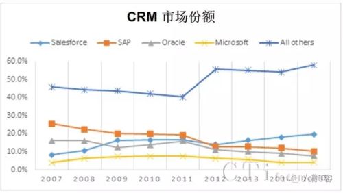 根据Gartner对CRM历年的市场收入和市场份额情况,Chuck Schaeffer整理了从2007年到2015年全球主要CRM软件供应商(包括Salesforce,SAP,Oracle,Microsoft),以及其他产品供应商市场份额的变化情况。