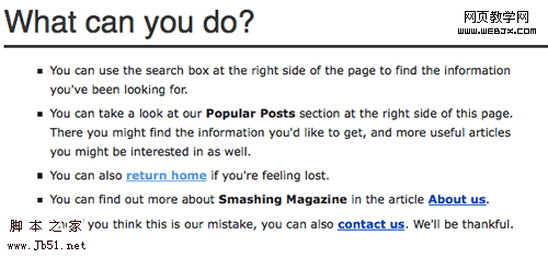 如果你不明确的告诉你的服务器如何处理404错误,它将默认提供一个单调而普通的错误页面。比如在一个白色的页面上显示“没找到 – 请求的URL不能被找到”云云。对用户来说,这是毫无帮助的和相当痛苦的。一个404页面应该开起来像个错误页面,但是它也应该看起来仍然是你的网站。如果你在是用一个CMS,一般来说这已经为你处理好了。如果你使用一个静态网站,你可以通过你的.htaccess(Apache服务器)文件指定一个404模板。