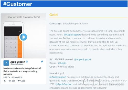 > 推特为苹果AppleSupport账户颁发客服金奖