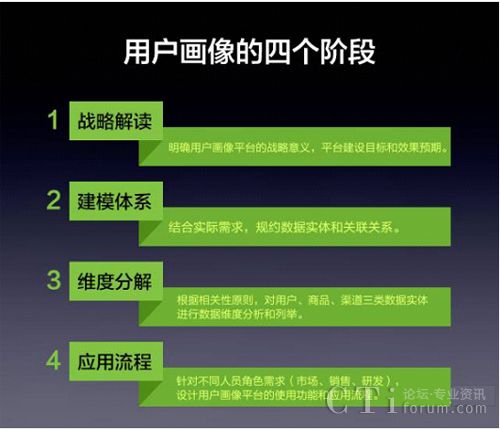 具体来讲,当为用户画像时,需要以下四个阶段: