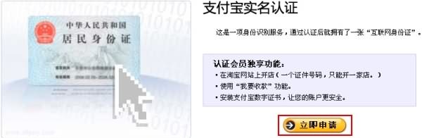 进入支付宝实名认证的介绍页面,请点“立即申请”继续;