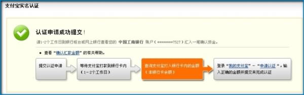 认证申请提交成功,等待支付宝公司向您提交的银行卡上打入一元以下的金额。