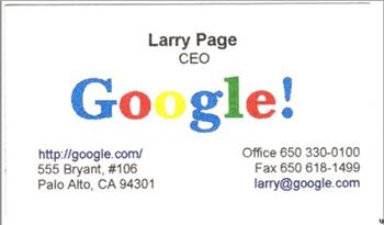 从佩奇曾经用过的一张名片上可看出,谷歌标识尾部上曾加上了一个惊叹号(见图),这表明当时两位创始人确实对雅虎怀有敬意,因为雅虎名称后面就一直加上一个惊叹号。从这张名片上还可看出,当时谷歌办公地点已由车库迁至帕罗奥多(Palo Alto)市。