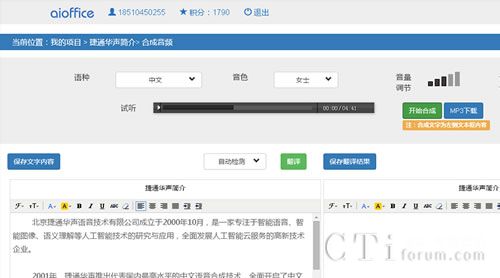 Aioffice中的语音合成功能,可以将大段话由文字转换为录音,例如一部长篇小说,可以分成多个章节进行转写并命名,方便在不能够看书的时候听书;也可以将一长段需要在会议、会场朗读的文字使用语音合成系统合成;再有超市需要较长的语音播报,可以直接使用Aioffice中的语音合成进行合成。