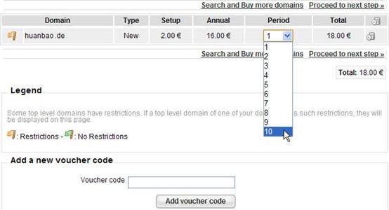 这时,默认注册年限为1年,大多数后缀,你可以修改为1-10年,有一点提醒各位一下,EuroDns域名注册费比较高,而且目前的优惠码只有新注册的,没有看到续费的,大家注册时如果可能尽量选择十年。以QQPCC注册的.de为例,官网价格为16欧元/年,另外需要2欧元的初装费,使用优惠码后只要4欧元/年,十年只要42欧元,相当超值。