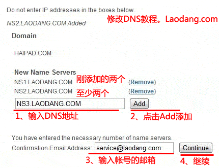 5、新页面中,在New Name Servers 中添加您的DNS服务器地址,然后点击“Add”按钮,