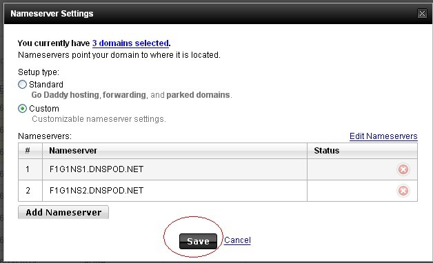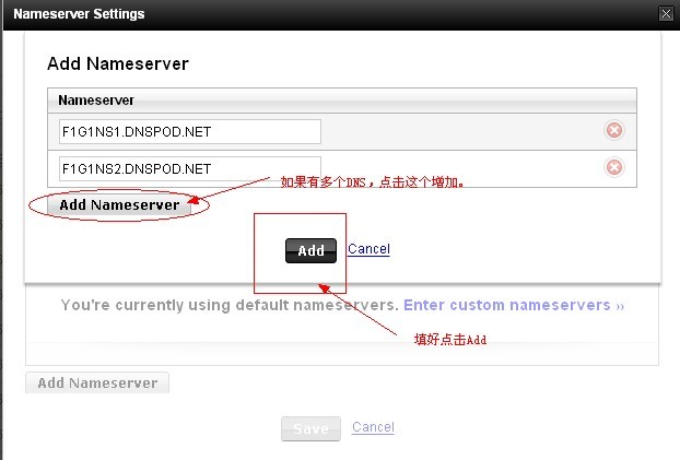 4:示例填的是DNSPOD的DNS,填好点击Add,(如果你的DNA有4个或者更多,点击Add Nameserver来增加)。