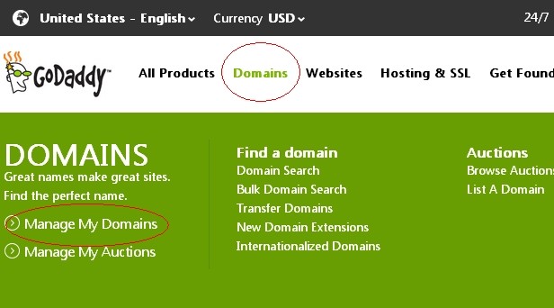 1:先登录好,如图依次选择Domains--Manage My Domains进入域名管理界面。