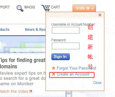 1、进入Moniker.com官方网站,http://www.Moniker.com ,鼠标放到右上角“SIGN IN”黑色按钮,下滑页面中,点击“Create an Account”链接。