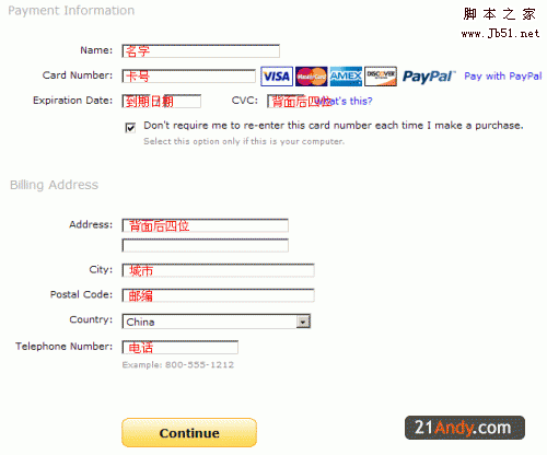 五、登陆帐号后,会提示您输入信用card或Paypal信息。如实填写即可。点击Continue进入下一步