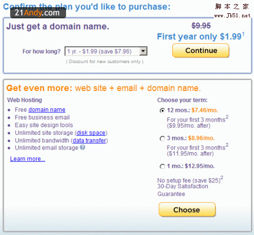 三、在这个页面可以选择注册年限(1至5年),推荐1年,因为头一年是$1.99美元,多申请就$7.96咯!至于下面的MAIL服务如果不许要不要 选择。确定年限后点击Continue。