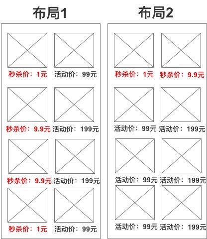 商品的布局也很重要,不要将秒杀商品完全堆砌在一起,很容易让用户错失浏览其他非秒杀商品的机会;如图:你选哪一种商品布局?
