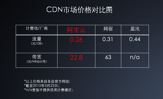 5月22日,全球领先的云计算厂商阿里云宣布下调其拳头产品“极速CDN”的价格,降幅达21.2%。调整后的价格对比传统CDN厂商价格接近“腰斩”。阿里云计算CTO章文嵩表示,本次价格调整得益于规模提升后的整合效应和技术革新,我们希望不断向用户分享这一红利,以支持更广泛的创新创业。