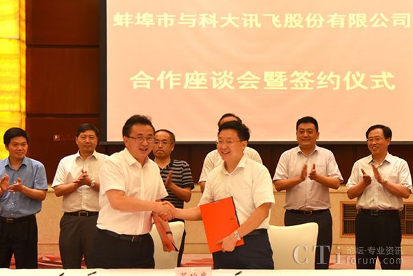 6月23日下午,科大讯飞与蚌埠市合作座谈会暨签约仪式在蚌埠市举行。蚌埠市市委书记周春雨主持座谈会并见证签约,蚌埠市市长白金明与科大讯飞董事长刘庆峰共同签署战略合作协议。出席签约仪式的还有蚌埠市领导胡朝荣、杨森、吴扞卫、吴中尧,科大讯飞张友国、孙曙辉、周玲玲、严俊峰等。