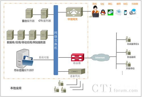 12345政府服务热线平台由深海捷科技的软交换系统、人工坐席系统、业务系统、系统管理、自助查询系统;及CTI服务器、数据库服务器、应用服务器、WEB网站服务器、APP服务器、备份服务器等组成。并且支持多渠道和群众互动,包括走访、信访、热线、短信、传真、邮件、APP、网站、微信、QQ语音等等。