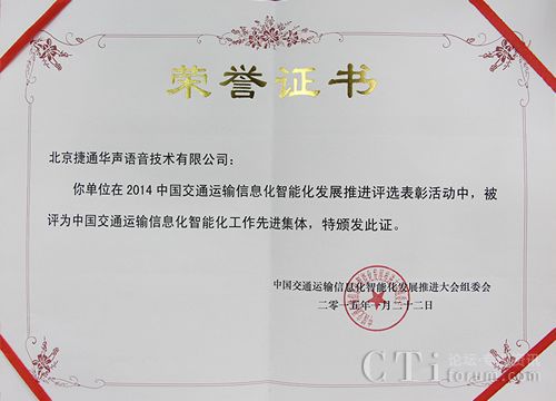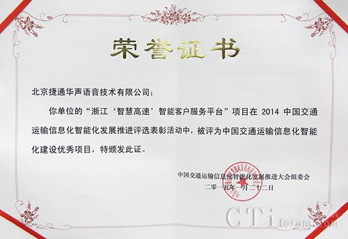 灵云科技讯:由中国交通运输协会主办的“2014中国交通运输信息化智能化发展推进大会”于1月22日至23日在京成功举办,捷通华声受邀出席本次大会,捷通华声灵云智能客服系统凭借“浙江'智慧高速'智能客户服务平台”项目的示范性作用荣获《中国交通运输信息化智能化建设优秀项目》奖。