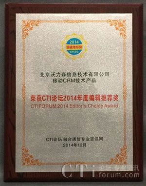 CTI论坛2014年度编辑推荐奖评选活动在北京3W互联网主题咖啡馆圆满举行。此次盛典揭晓了由业内知名人士、知名媒体共同评选CTI论坛编辑推荐奖,XTools移动CRM荣获CTI论坛2014年度编辑推荐奖技术产品奖。