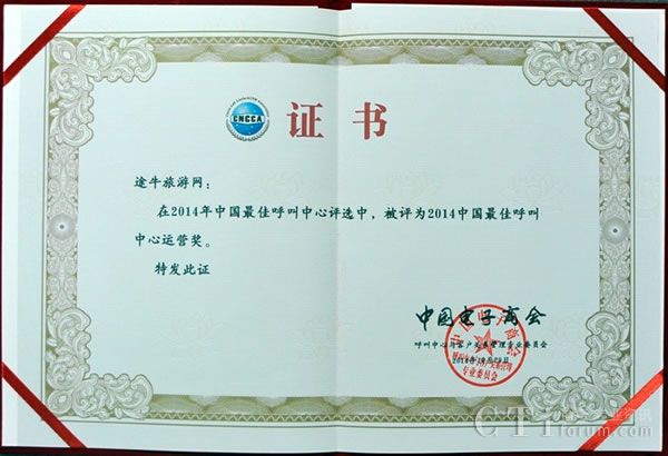 本次峰会由国家级行业协会中国电子商会呼叫中心与客户关系管理专业委员会(CNCCA)牵头,获得了国家工业和信息化部的支持,是代表中国惟一接轨亚太地区呼叫中心年度大奖的评选。颁奖盛典当日,国家相关部门领导,英国、美国、印度、韩国、德国日本、台湾、香港等地区呼叫中心行业机构前来参加,来自众多世界500强及知名企业的管理层,近千名参展厂商代表及观众,共同见证了这一极致荣耀。大会上,途牛网凭借“客户为先”的质量方针,全面专业、贴心的“一对一管家式”服务,呼叫中心售前、售中、售后全环节跟踪服务,专属客服24小时快速反应等服务与优势,荣获“2014中国最佳呼叫中心运营奖”。